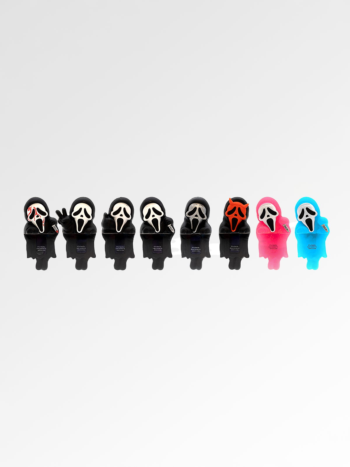 • Scream-themed phone huggers with black, red, pink, and blue colors on a white background.